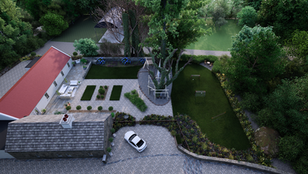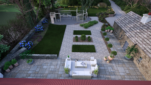 This traditional garden design beautifully complements the renovated property, featuring a well-organised layout that balances elegance and practicality. The image showcases a spacious parking area at the front, a charming courtyard with cosy seating for relaxation, and a dedicated play area for children. The design seamlessly blends classic garden elements with family-friendly functionality, creating a welcoming and timeless outdoor space.